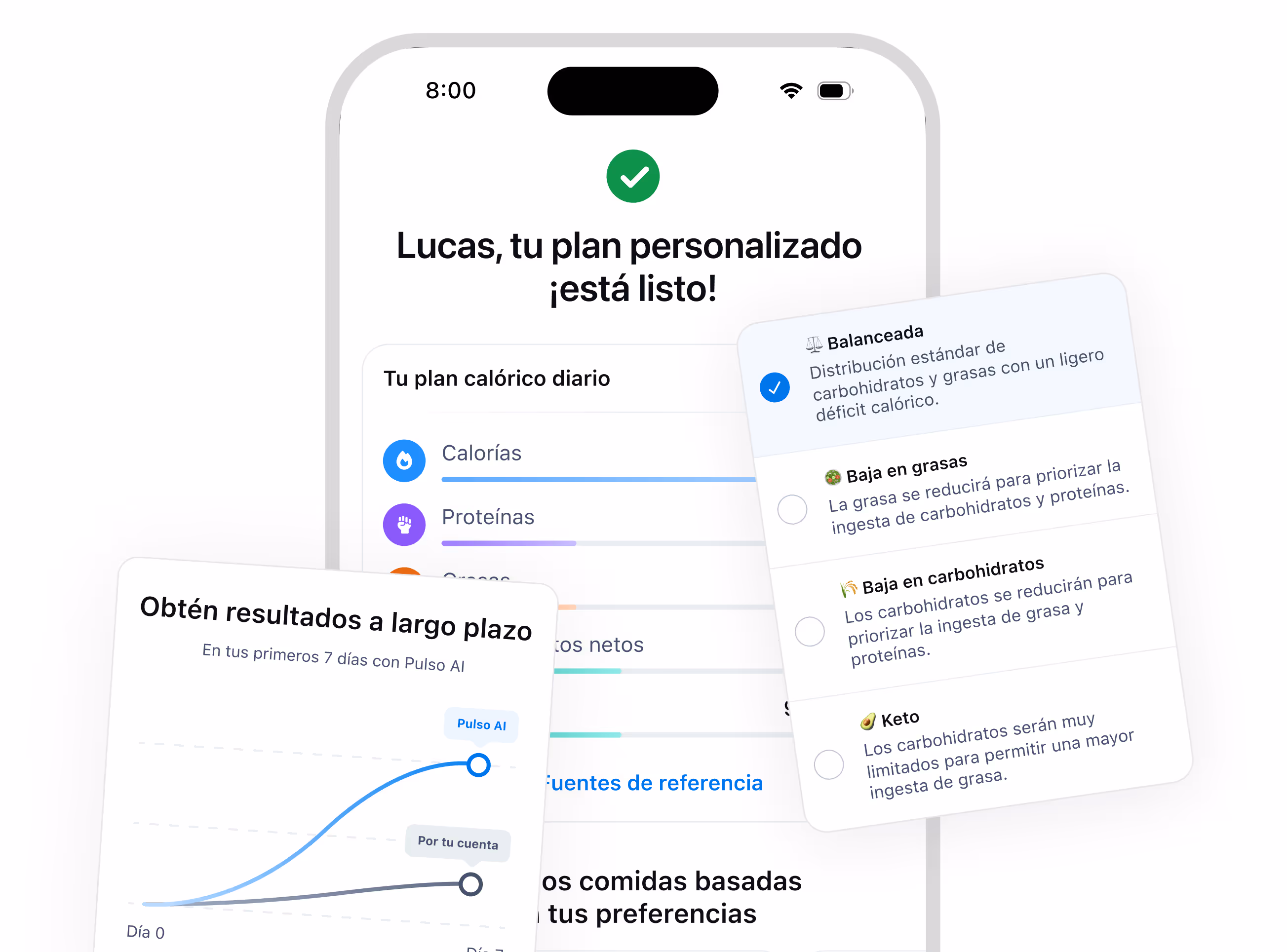 Comparte tus objetivos, tipo de dieta, edad, contextura física y otros datos para que Pulso cree tu plan personalizado de alimentación.